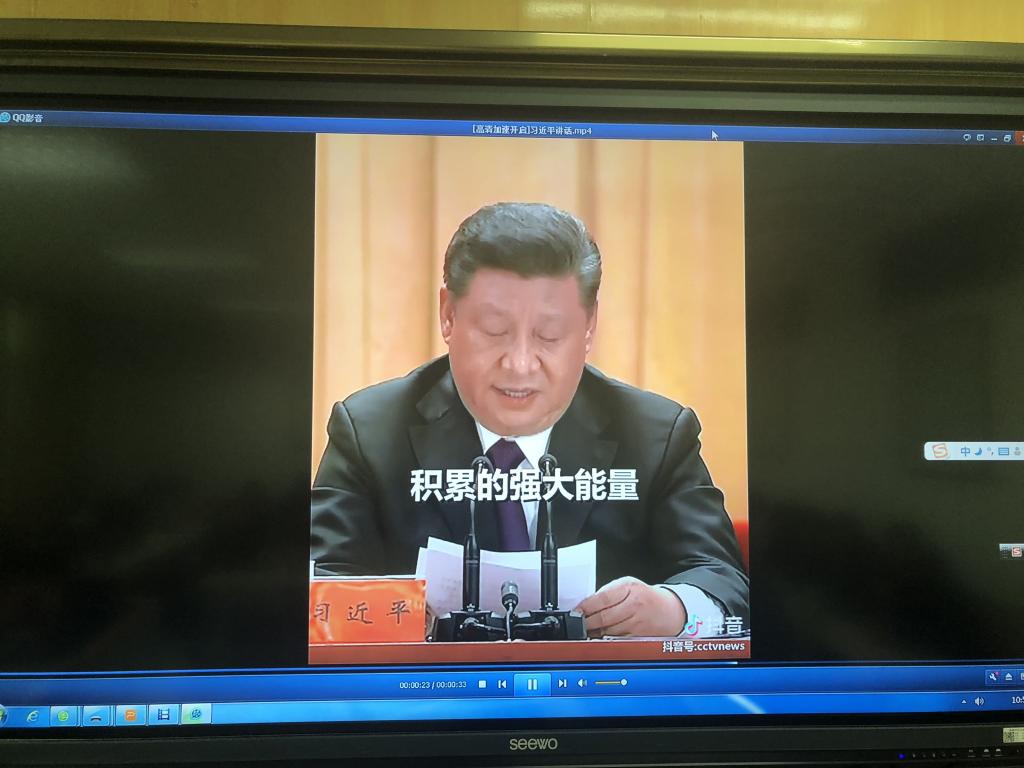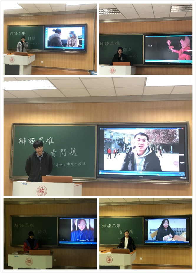 一切就绪后,“辩证思维看问题小组赛”正式开始。各团员小组代表依次上台,分别从“怎样看待现在的抖音、快手等短视频APP”“怎样看待大学生的能力和成绩的关系”“怎样看待父母在当代大学生中所扮演的角色”三个方面入手,再辅以提前街采的视频,或激情昂扬,或委婉抒情,向与会团员们充分细致地展现了当代青年对于辩证思维的看法以及青年辩证地认识、分析、解决问题的能力。各小组各具特色的视频和讲解,使台下团员掌声连连。