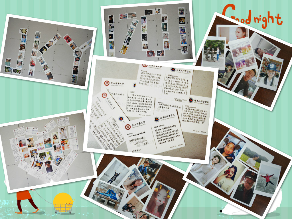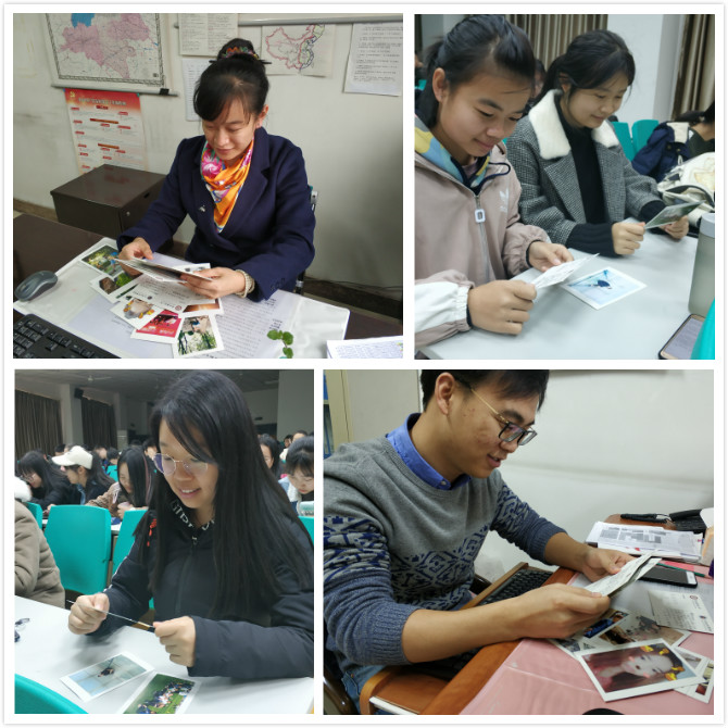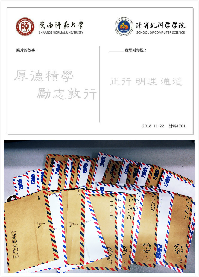 说。这次团日活动为大家提供了这样的机会,每位同学都积极参与并选择自己拍摄的图片设计明信片,每一张明信片都是独特的同学们提供图片,有自己的照片,有陕师大的美景,有自己喜欢的明星偶像,有自己设计的卡通人物,都记录了每位同学一年中的珍贵回忆。定制成明信片,写出自己对学院、导员、班级、同学们想说的话,在明信片的背后我们写出了自己的心声,字字句句皆是真情。这些明信片都将由团支书进行汇总送达。还有一封“写给未来的自己”的信,团支书将在毕业的时候发还给大家,给大家一个未来的惊喜。
