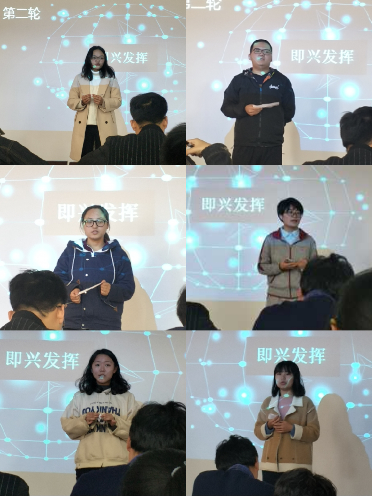 在主持人的引导下,选手们通过抽签顺序,依次上台演讲。本次比赛分两轮进行,第一轮是主题演讲,第二轮选手将依照上一轮比赛成绩由高到低依次抽取即兴发挥的主题,并在两分钟后进行观点陈述,小组最终成绩由老师评委与大众评审的综合打分决定。
