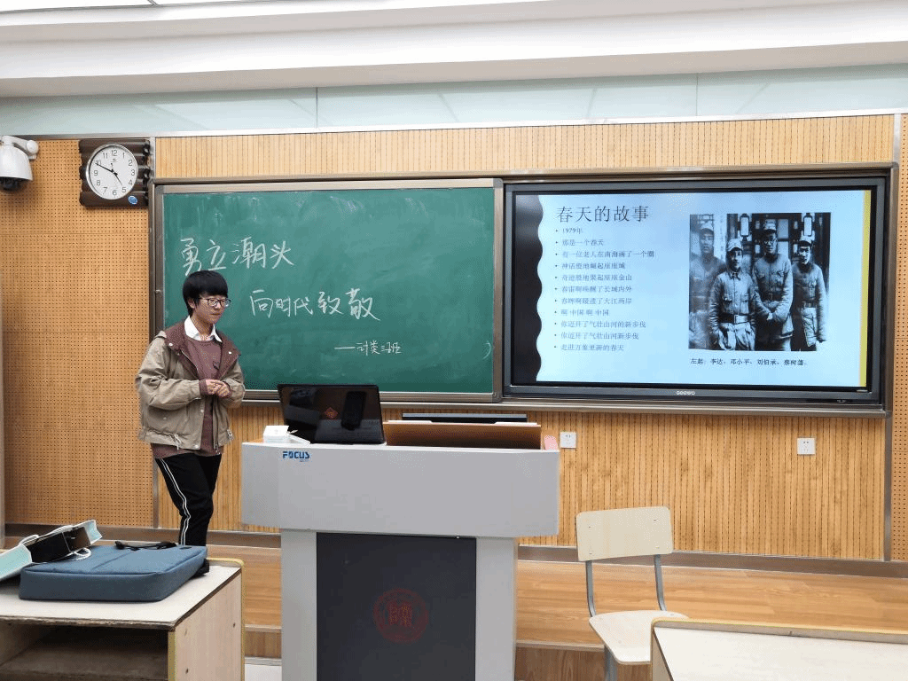 “1979年,那是一个春天,有一位老人在中国的南海边画了一个圈……”一首《春天的故事》向同学们娓娓道来改革开放的开端。深圳——一个小小的渔村摇身一变,成为当今经济发展水平最高的城市之一。紧接着,主持人向大家展示了改革开放四十周年以来,我国在经济、思想、能源工业等各方面取得的成就,让同学们了解到了改革开放给中国人民面貌带来的历史性变化,这不仅仅是在生活水平的提高,还有精神生活和思想观念的巨大转变。