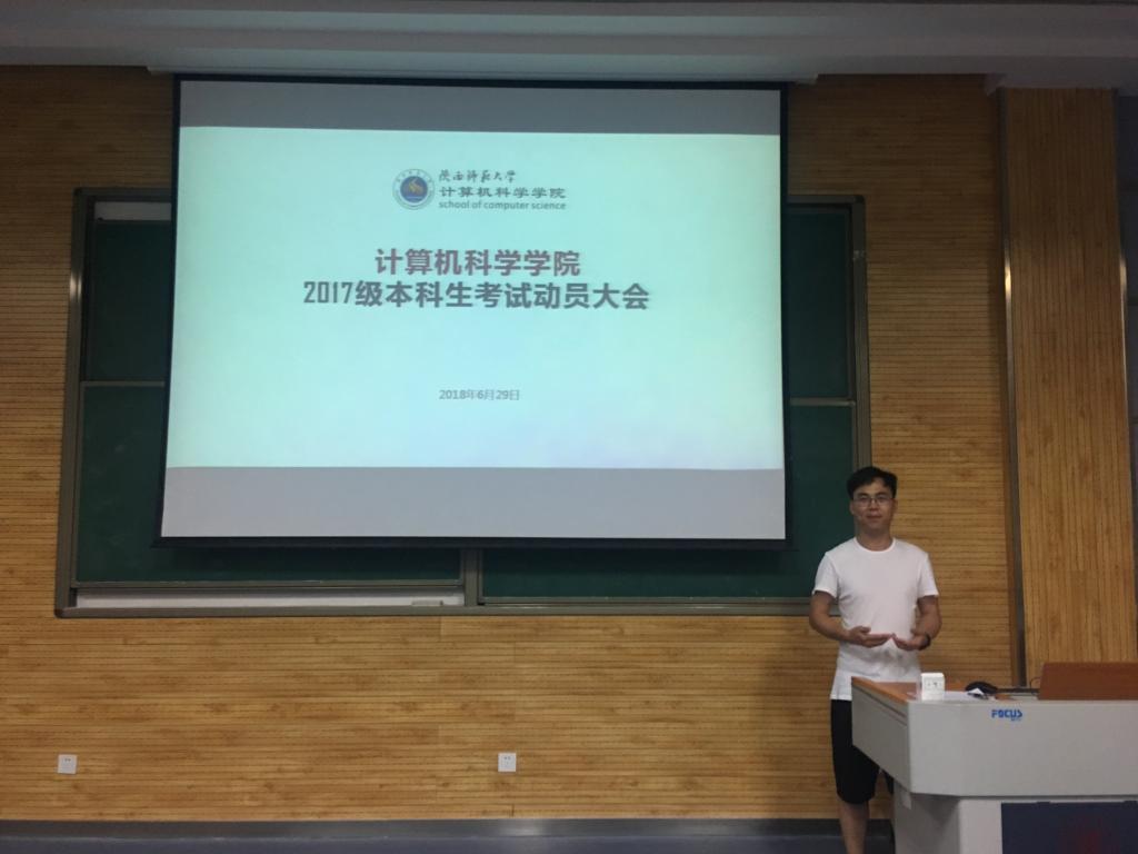 2017级全体本科生在雁塔校区教学五楼5201召开了本学期的考试动员会。本次大会由2017级辅导员陈应权老师主持。