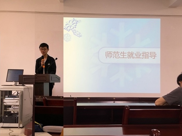 第二位主讲人是2014级计算机科学与技术一班的来自陕西商洛的李孝潮同学,已签工作于长安三中。他讲到面试是一个表现自己的机会,面试时一定要注意自己的谈吐举止,最重要的就是要有自信。他告诉同学们找工作期间要通过各种渠道留意跟自己有关的就业信息,比如师范生群、师大就创网、省教育厅网站等。