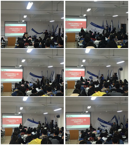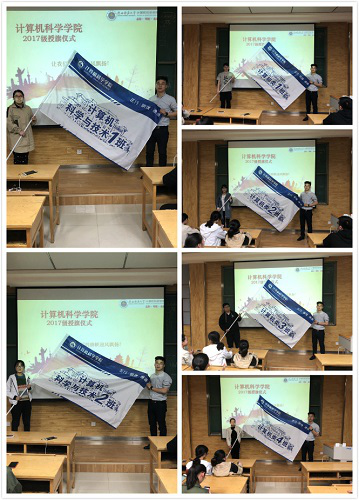 3月25日晚7点,2016级的班旗授予仪式在长安校区文津楼3424成功举办,授旗仪式由2016级本科生辅导员毛庆老师、王靓颖老师主持,两位老师将全新的班旗分发到各个班级的班长手中,并将旗挂上旗杆。各班都在班旗上下足了功夫,展示出自己的风采。计算机科学与技术1602班的芯片的设计,软工1602班的师大全景图给人留下了深刻的印象。