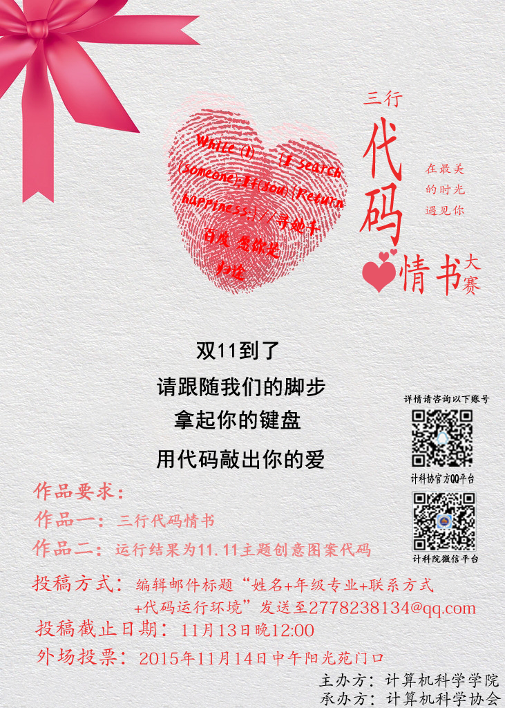 11月14日,计算机科学协会“三行代码情诗大赛”在阳光苑广场成功举行。活动历时一天,现场环节设置丰富,同学参与积极,气氛热烈,获得了极大的反响和小伙伴们踊跃的投票,给三行代码情书大赛外场画上了一个完美的句号。
