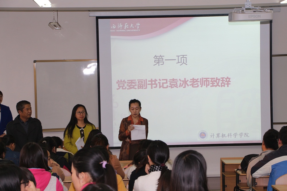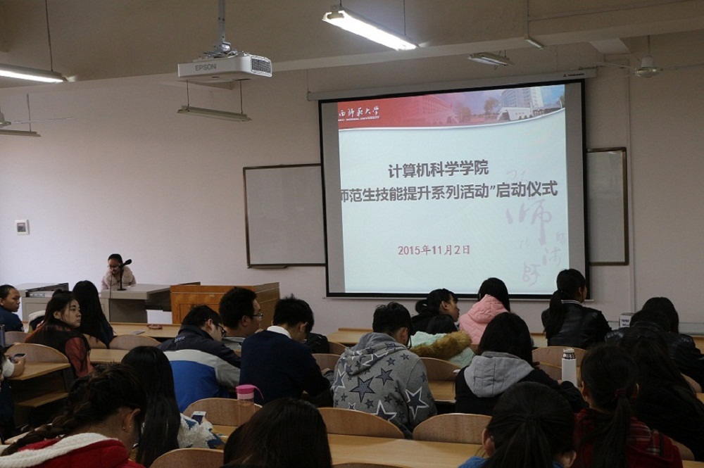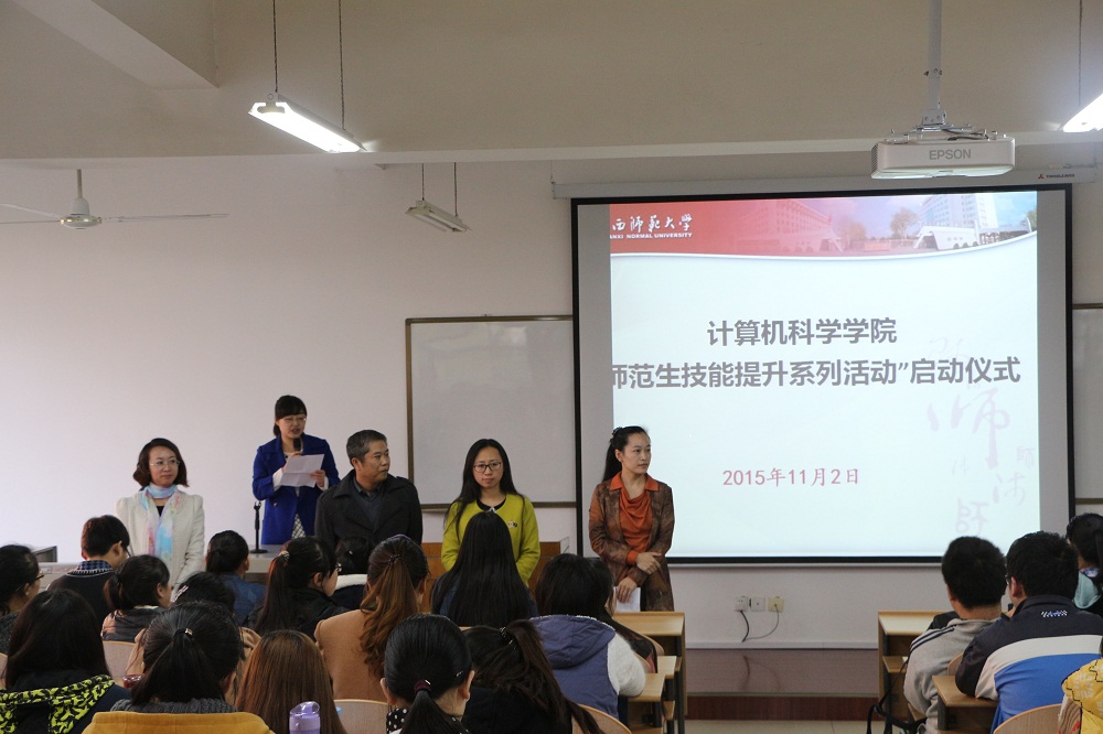 “师范生技能提升系列活动”启动仪式在文津楼219教室举行。学院党委副书记袁冰、副院长马苗、团委书记胡雯洁、教学秘书朱炜、2012级辅导员张冲、2013级辅导员冯倩出席了启动仪式。2013级、2014级计算机科学与技术专业全体免费师范生参加了本次活动。启动仪式由2014级辅导员郭康凌主持。