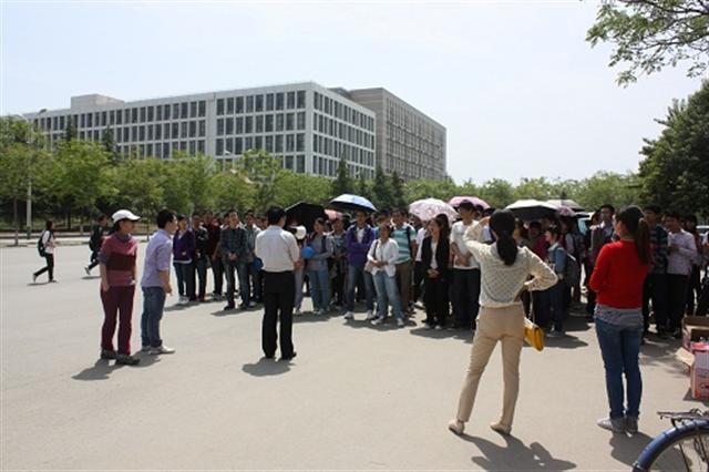 党委书记胡波、党委副书记袁冰、团委书记胡雯洁、2009级辅导员郭康凌和2010级辅导员张冲在田径场前对91猫先生