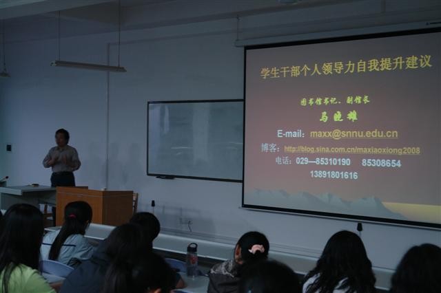 随后,图书馆党总支书记,副馆长马晓雄老师为来自三个学院的100名学生干部做了题为《学生干部个人领导力自我提升建议》的专题讲座。马晓雄讲到做学生干部工作在于追求大学教育的附加值,社会的评价标准和学校内部的评价标准是不同的。同时讲述了学习中的误区,并形象的将学习三境界比喻为蜘蛛式、蚂蚁式与蜜蜂式学习。教同学们要学会使用“卮言”,进行开放性思维与教育反思。其实人人都具有领导潜质和潜能,只是有待于开发而已。最后,马晓雄做了关于领导力特质的测量表,以帮助同学们了解自我能力的缺失,并提出关于学生干部个人领导力提升方法的建议,便于帮助大家更好的完善自我。