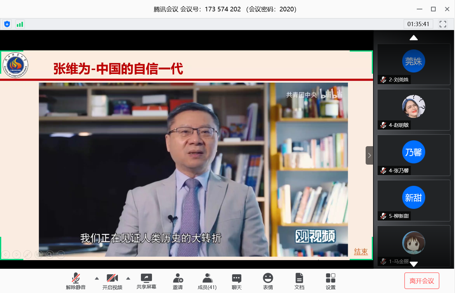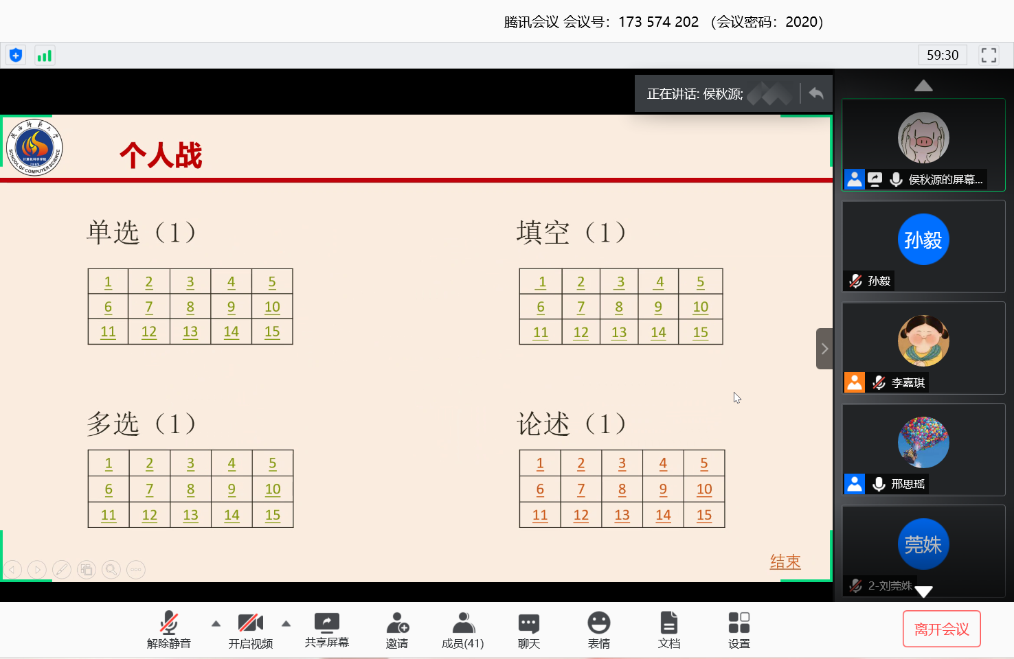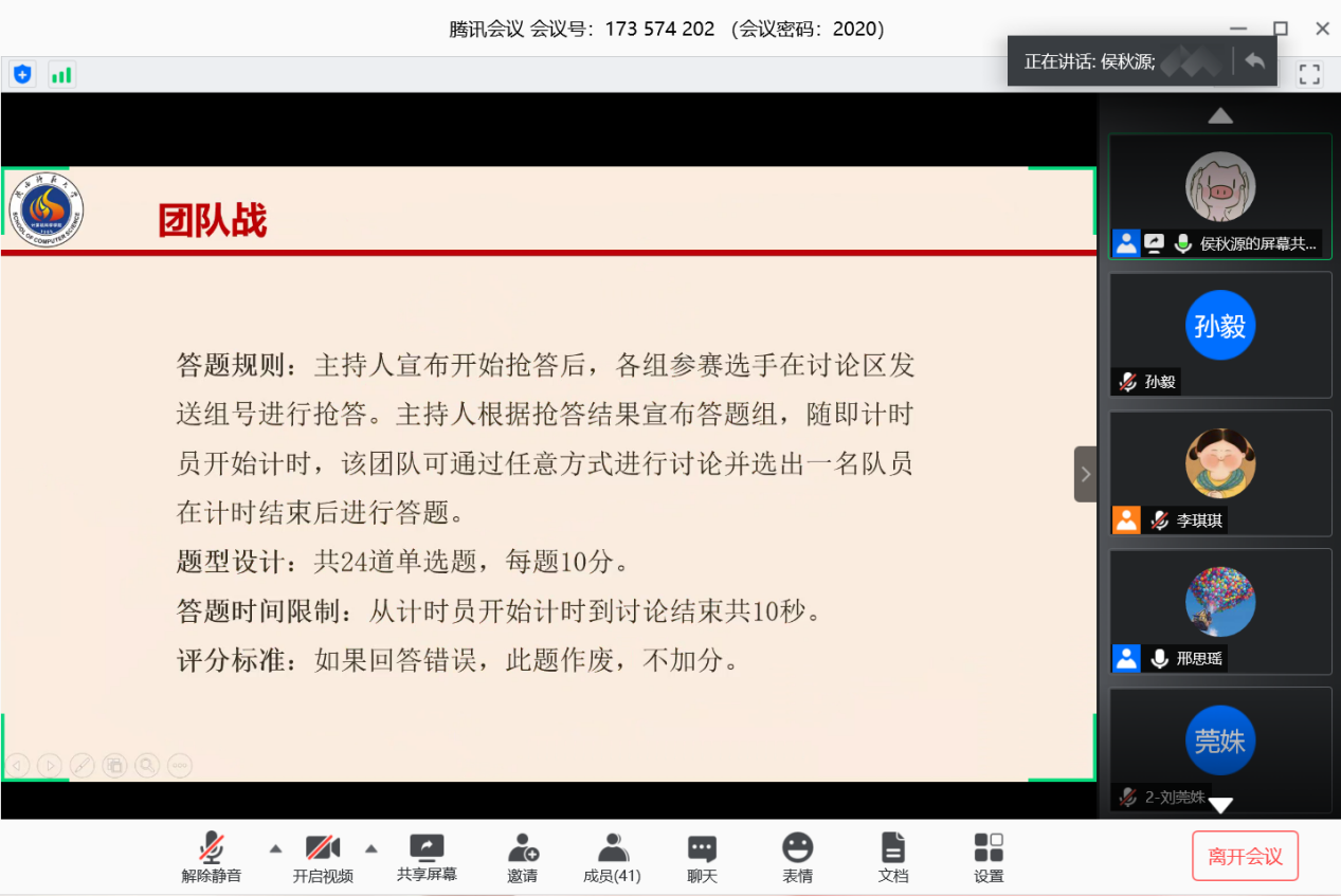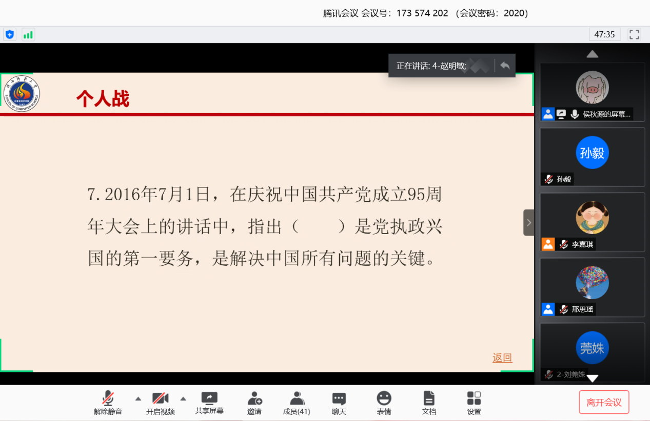 决赛分为两轮,在腾讯会议平台上开展。第一轮为团队赛,共有24道单选题。各参赛团队反应迅速,踊跃参与,在讨论区发送组号进行抢答。经过激烈的比拼,共有15名选手晋级第二轮个人战,选手们轮流回答单选、多选、填空和论述题,刘真、甘毓琪等同学在论述环节的发言旁征博引,充分体现了当代大学生的风采担当与过硬的思想政治素质。全体参赛选手还共同学习了复旦大学中国研究院院长张维为先生的演讲《中国的自信一代》,更加坚定了与时代一起成长、与国家一起崛起的信心。