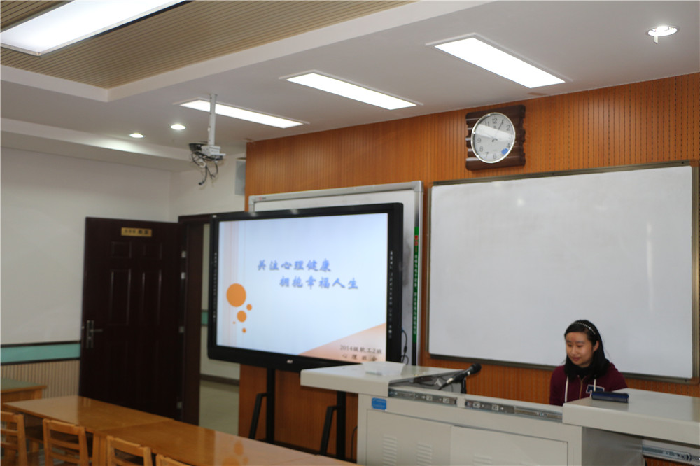 2014级软件工程二班在文津楼举办了学期第一次心理班会,主题为“关注心理健康,拥抱幸福人生”。班会目的为丰富班级同学心理知识,减轻心理压力,增强心理素质,由班级心理委员陈舒嘉策划并主持。