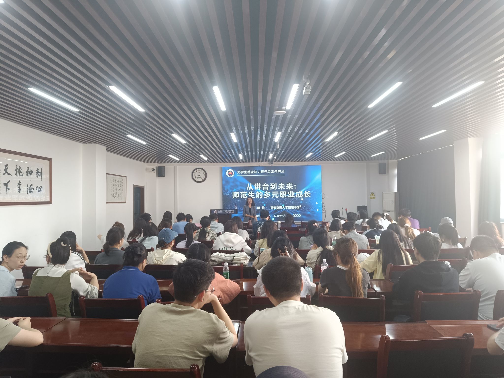 在文津楼3425报告厅组织2026届毕业生开展名师谈职业成长分享交流活动。西安交通大学附属中学高级教师、省级学科带头人蒋帅老师和2026届毕业生参加活动,辅导员田海东主持。