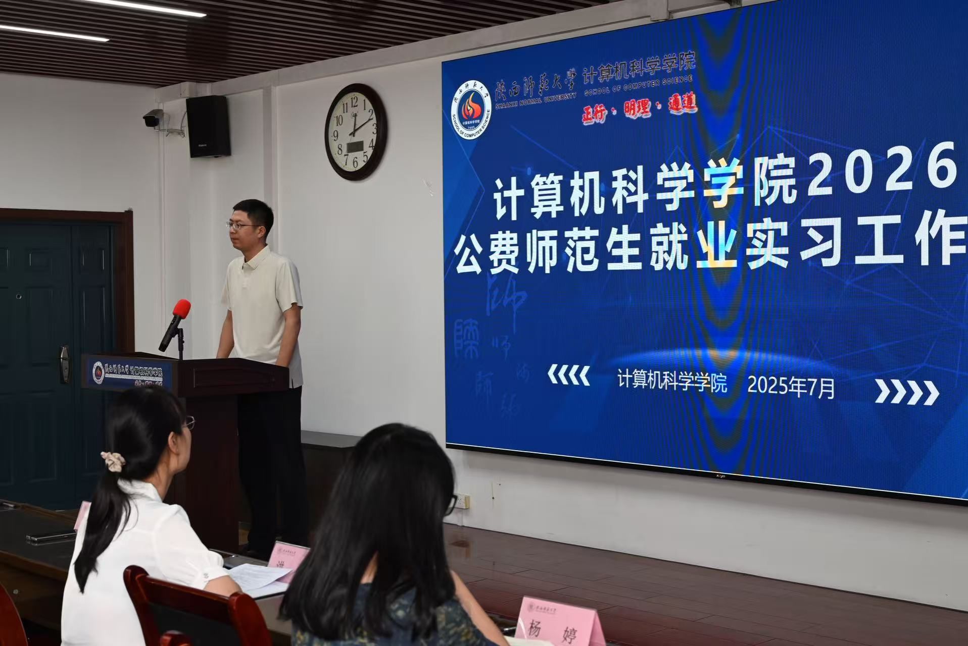 在文津楼3425报告厅组织召开2026届公费师范生就业实习工作会议。学院副院长李鹏、党委副书记郭康凌、公费师范生专业负责人洪灵、教学秘书杨婷、2026届公费师范生参加,会议由辅导员田海东主持。