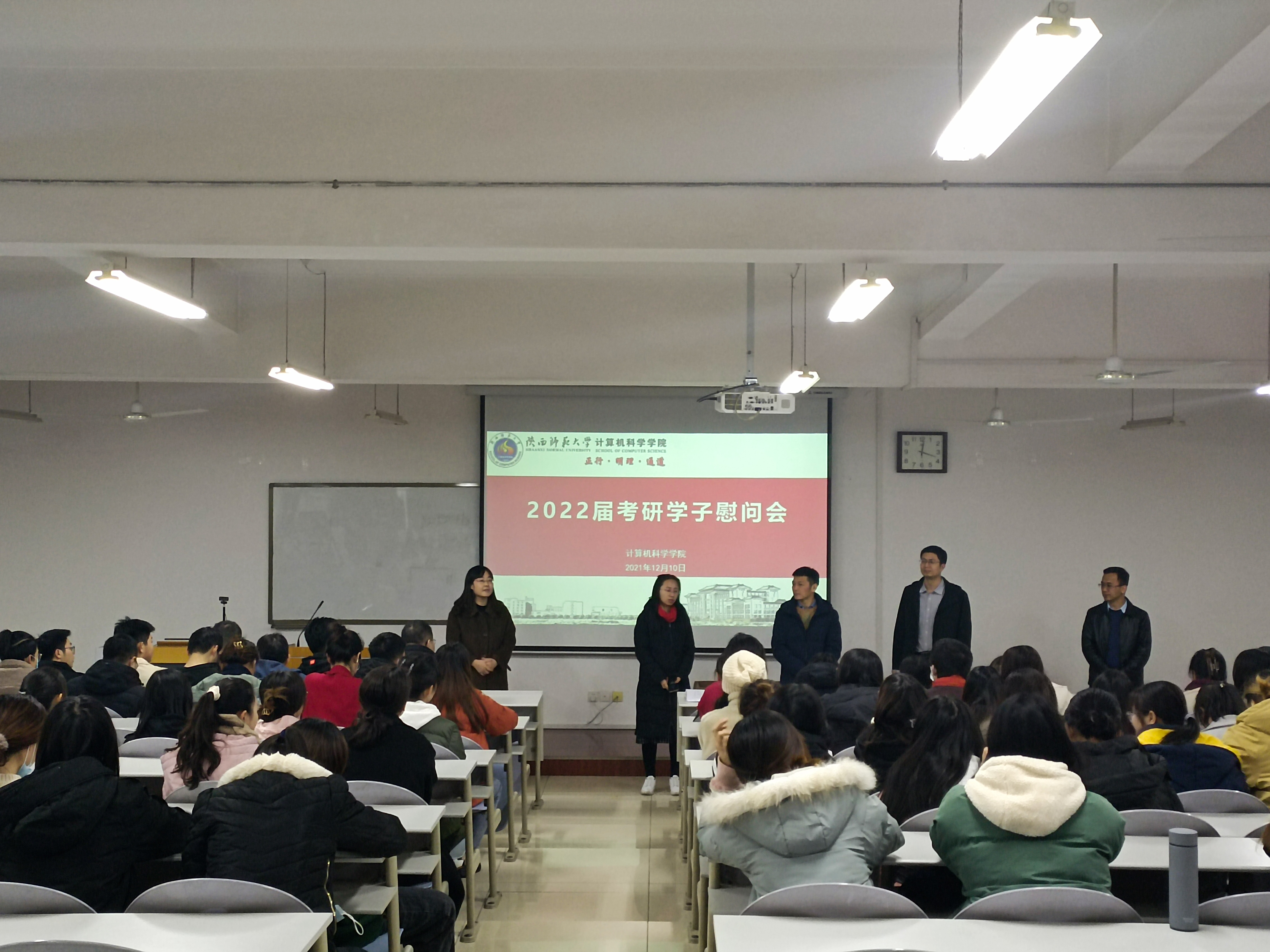 在文津楼3424教室组织了2022届考研学子考前慰问会。学院党委书记王耀明,副院长马苗、李鹏,党委副书记郭康凌以及2022届考研学子参加慰问活动,活动由2018级辅导员田海东主持。