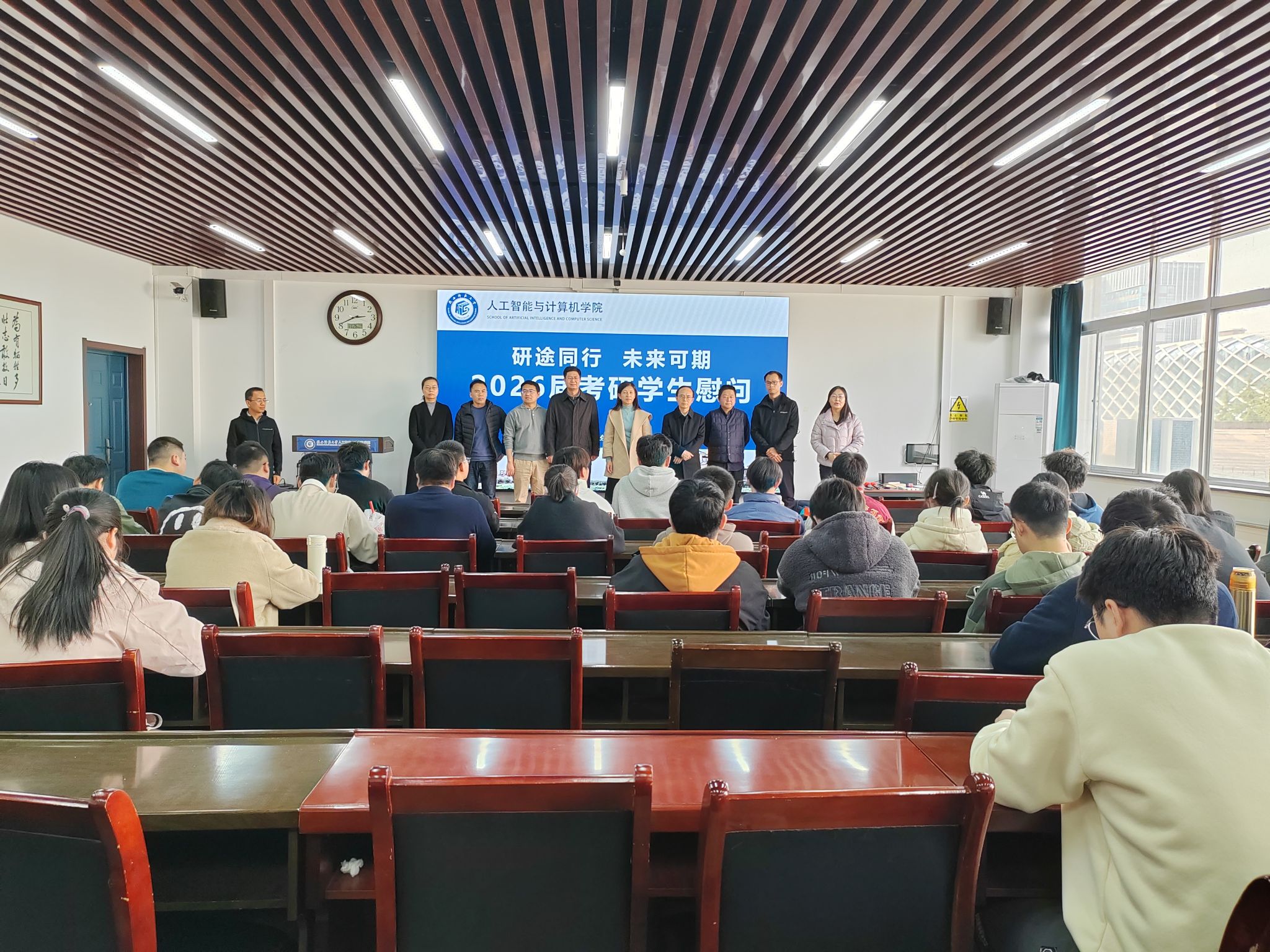 组织2026届考研学生慰问会。学院党委书记张艳兵、院长姚若侠、副院长禹勇、李鹏,班主任程适、李志强、田丰、刘明,辅导员田海东和2026届考研学生参加慰问活动。活动由党委副书记郭康凌主持。