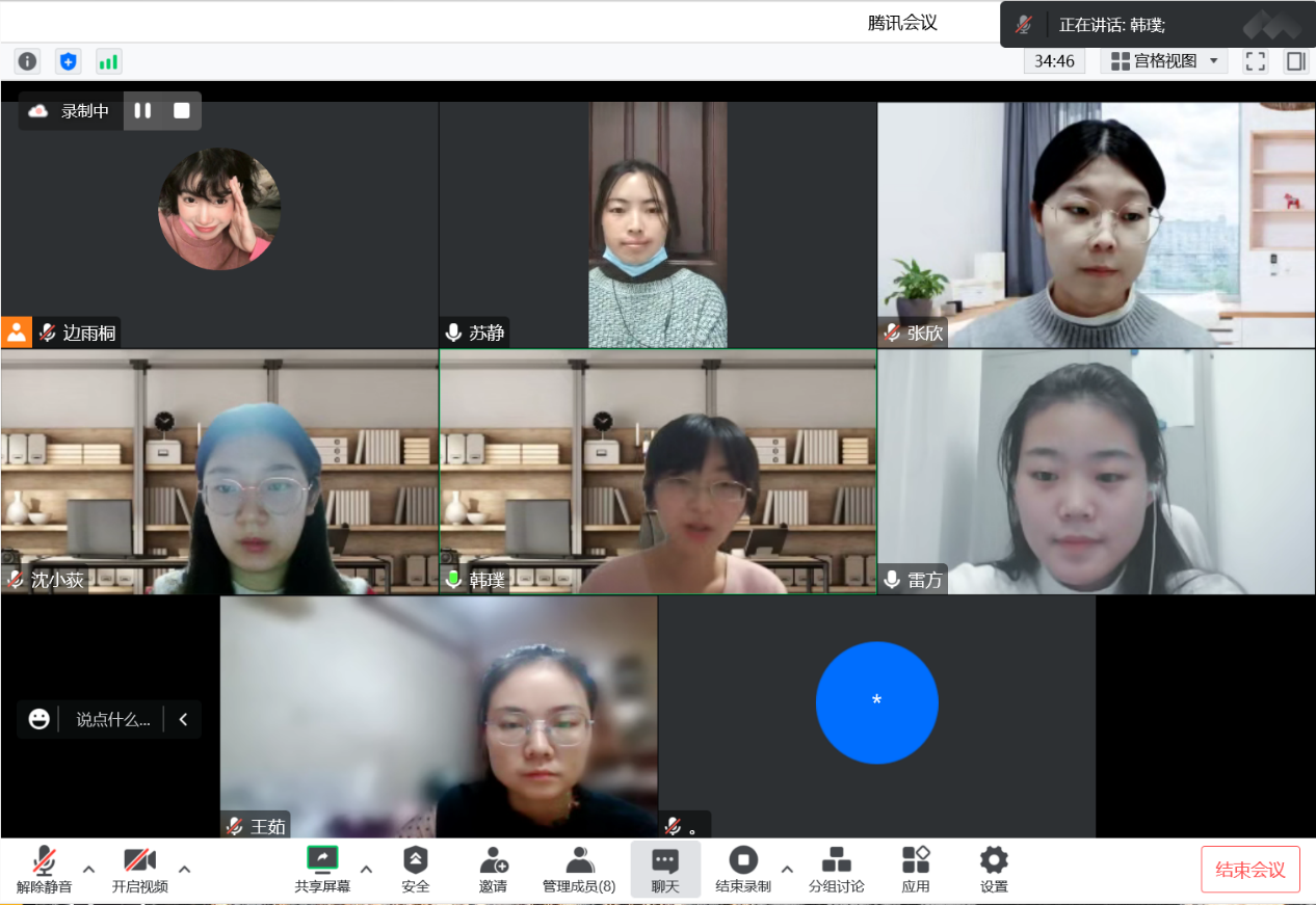 韩璞要求同学们采取视频交流的方式,更快速直接地得到同学们的反馈。参会同学依次介绍自己的基本情况、求职经历以及自己的现实困境同老师进行分享、交流。韩璞结合自己多年的就业工作辅导经验,鼓励同学们要树立信心、做好充分面试准备,以达到一个良好的就业心态。韩璞表示良好的心理素质是同学们求职路上不可或缺的“神兵利器”,心理素质在很大程度上会影响到一个人能力与水平的发挥。