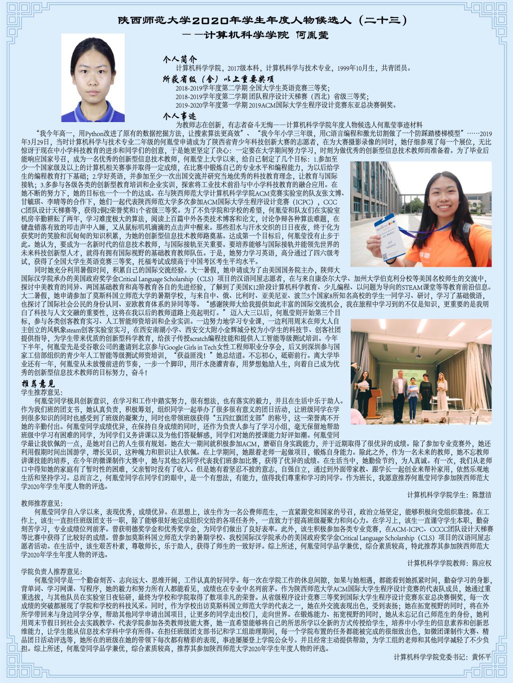 青春逢盛世,奋斗正当时——91猫先生 2020年学生年度人物候选人91猫先生 2017级本科生何胤莹