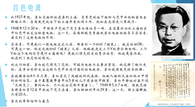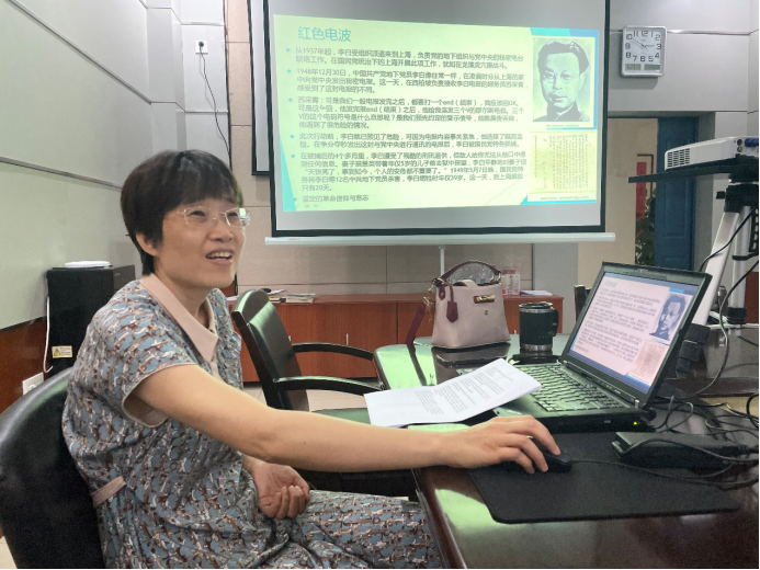 首先,汪西莉带领大家重温了“红色电波”的记忆。红色电波在中国革命取得胜利的过程中发挥了至关重要的作用,可以说,中国无线电发展史对于中国共产党百年奋斗史而言,是隐蔽战线上永不消逝的电波,也是伴随建党百年的一根红线。汪老师激动的说,地下工作者共产党员李白在上海即将解放之时做出为革命献身的决定,是因为有着坚定的革命意志和革命信念,这些需要我们每位党员铭记和学习,并继续将这种精神传承和发扬。